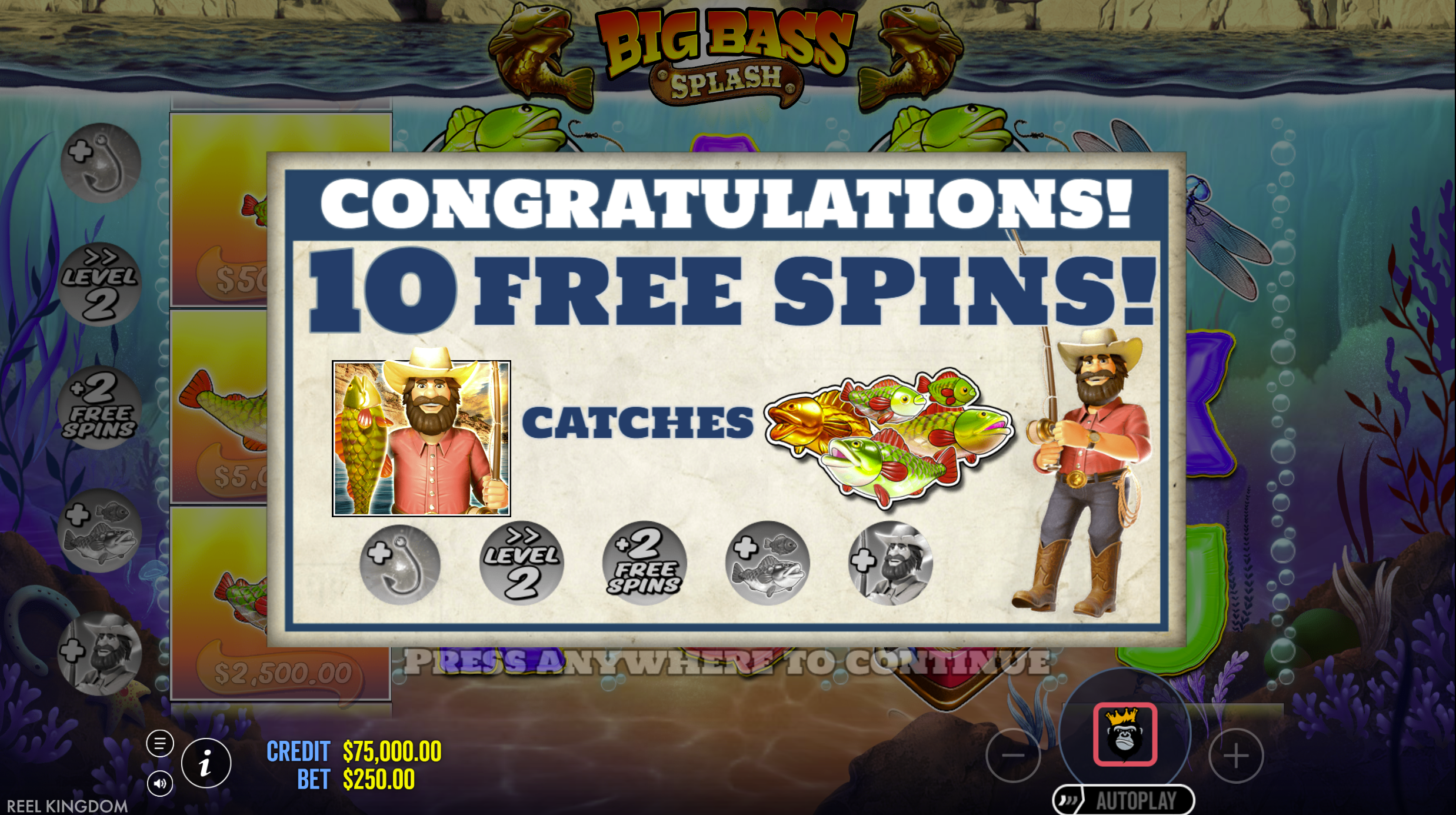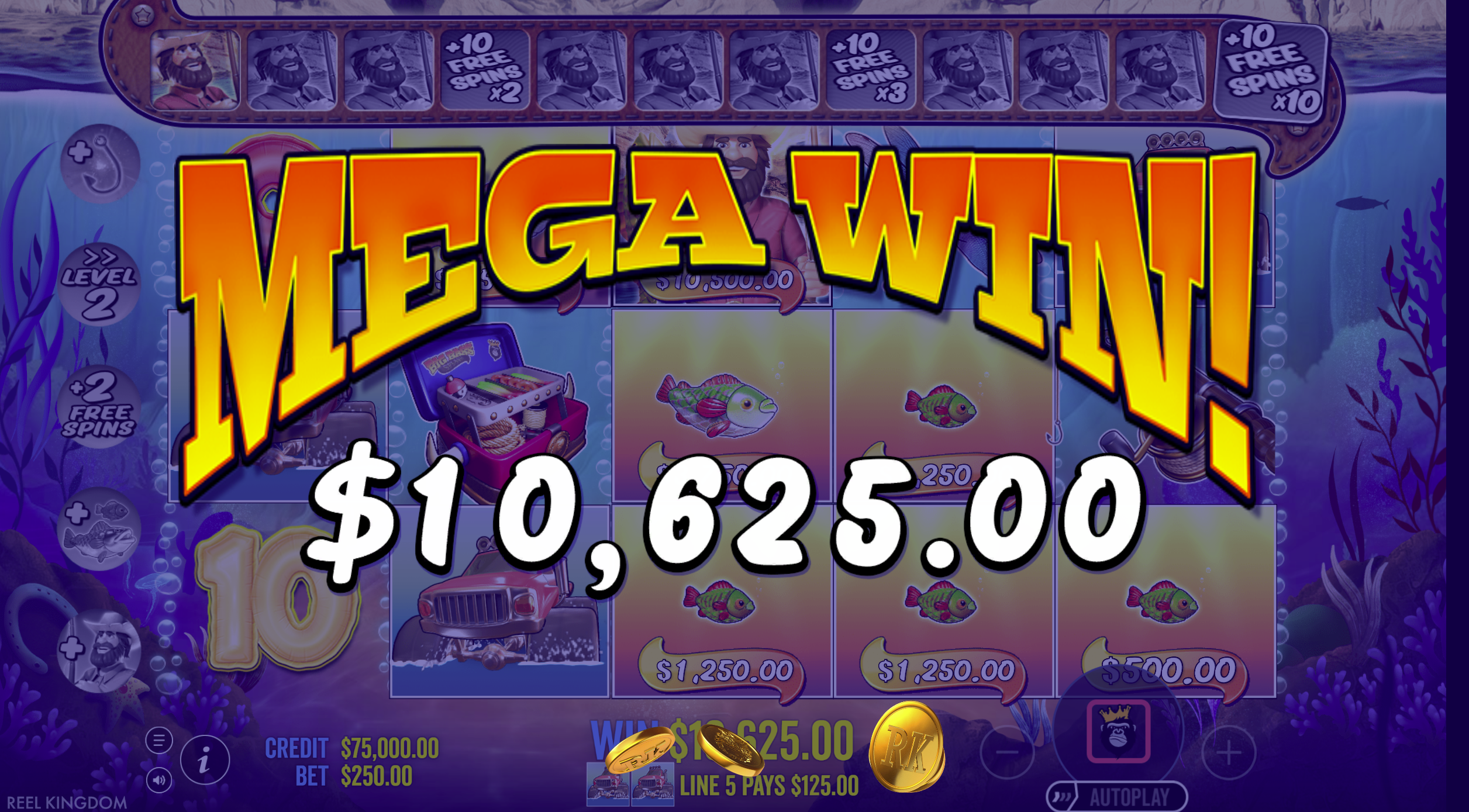 - Money Symbols (Fish with cash values): These can appear during both base game and free spins. In the bonus round, if a fisherman wild lands, it collects visible money values for cash prizes. :contentReference[oaicite:11]{index=11}